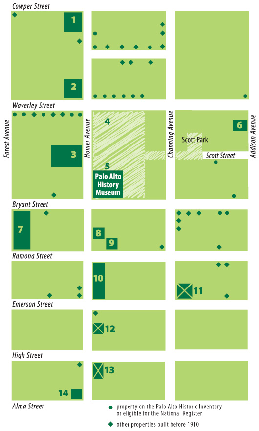 12 1890 - Site of early resident Anna Zschokke’s first house at 170 Homer Ave. The "mother of Palo Alto schools," she advocated successfully for a public school district and mortgaged her next house to open the first high school.